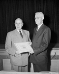 Guy Price, left, receives a plaque from Dr. W. J. Danforth, president of Goodwill Industries of Fort Worth, in recognition of services rendered to the handicapped by Price and the Fort Worth National Bank as trustees for the Etta O. Newby Estate. Published in Fort Worth Star-Telegram morning edition March 15, 1954.
