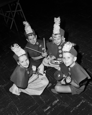 Four of the youngsters in the kindergarten class of Mary Louise Phillips Elementary School who took part in the school's rhythm program are, left to right, Sue Castles, daughter of Mr. and Mrs. V. C. Castles, 6441 Darwood; Robert Dalby, son of Mr. and Mrs. Chester and Beryl Dalby, 6405 Greenway; Sylvia Wehmanen, daughter of Mr. and Mrs. Oscar Wehmanen, 6324 Darwood, and Mike Strange, son of Mr. and Mrs. Leslie Strange, 3700 Wellington. The program was for the regular P-TA meeting. Published in Fort Worth Star-Telegram evening edition May 19, 1950.
