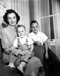 New president of Alpha Delta Pi alumnae is Mrs. Glenn Reynolds, pictured here with her sons at their home, 4812 Waldemar in Haltom City. The boys are, left to right, Larry, 2, and Jack, 7 1/2. Published in Fort Worth Star-Telegram morning edition May 11, 1954.
