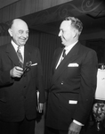 Harry W. Bass, left, president, Texas Mid-Continent Oil & Gas Association, chats with Perry Bass, association district vice president, at a reception honoring Harry Bass. Perry Bass spoke at a meeting of oil operators at Hotel Texas. Published in Fort Worth Star-Telegram morning edition March 17, 1954.