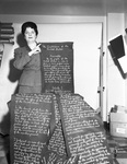 Miss Ann Necchi proves her skill as a sewing machine expert by printing the Constitution of the United States on 70 yards of wool felt. Her finished product is to be presented to President Eisenhower. Clipping reads: "The Constitution of the United States written by sewing machine is the unusual handiwork project that was on view in Fort Worth. Miss Ann Necchi of New York stopped in Fort Worth to display her craftsmanship. The lettering of the Constitution is done in strong white cotton thread with red underlines at the beginning of each paragraph. Heavy wool felt--70 yards of it--is the base of the lettering. So far she has completed 16 yards containing more than 2,000 words. When she has written the more than 10,000 words in the document, the piece will be presented to President Eisenhower. Miss Necchi, a sewing teacher, does the work in her spare time and has no way of estimating how long it will take her to complete the project." Published in the Fort Worth Star-Telegram morning edition March 17, 1954.