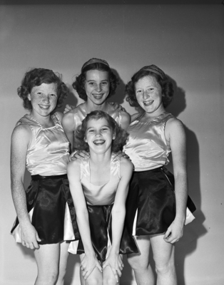 These two pairs of sisters will be among the top acrobats appearing at the recreation department's "Spring Revue of 1950" at Will Rogers Memorial Auditorium. The two in the center are Alice, back, and Mary Frances Grove of 1101 Park, daughters of Mr. and Mrs. Samuel Edward and Frances Lucille Grove. Also sisters are Guerry Ellen, left, and Delores Leddy, right, daughters of Mr. and Mrs. Silas and Raye Leddy, of 1711 Homan. Published in Fort Worth Star-Telegram morning edition May 19, 1950.
