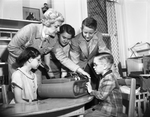 Dr. Mary Karraker, director of the Treatment Center of the Crippled Children's Society of Fort Worth, tries a new record player given the center by the Central Methodist Children's Church. Jan Chapman and Jim Chafee, standing to her right, are members of the church. Looking on are Sherry Smith, left, and Claude Beeman. Published in Fort Worth Star-Telegram morning edition March 17, 1954.