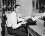 James Atlee Phillips, author-traveler, shown at a typewriter working. Published in Fort Worth Star-Telegram morning edition March 18, 1954.