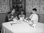 Mrs. Robert L. King tries out her children's party table arrangement on her daughter, Melinda, 5, and Tommy Logan, 5, son of Mr. and Mrs. Harry L. Logan Jr. Published in Fort Worth Star-Telegram morning edition March 28, 1954
