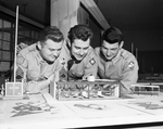 Three Arlington State College students from Fort Worth inspect an architectural exhibit by Richard M. Mayfield Jr. at the school's annual engineering show Friday. Left to right are Charles Gilbert, Gib Jentz, and LeVene Hughes. The boys are graduates of Fort Worth high schools. Published in Fort Worth Star-Telegram morning edition March 19, 1954.