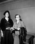 Mrs. Frederick Griswold Jr., of Montclair, N. J., left, education chairman of National Pro America, and Mrs. Arthur Bright of Spokane, Washington, first vice president, examine with approval the Fort Worth Public Schools' handbook for teachers. Published in Fort Worth Star-Telegram morning edition March 11, 1954.