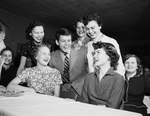 Members of Musagetes Dramatic Club, who turned out to hear Charlie Applewhite sing at a skyline appearance Sunday, are, clockwise around the singer starting at the bottom left, Judy Nichols, Zita Tyer, Suzanne Shugart, Glenda Tinkle, and Joan Tottenham. Published in Fort Worth Star-Telegram morning edition March 21, 1954.
