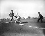 Oklahoma's Buddy Leake leaps in unsuccessful attempt to avoid tag of Texas Christian University First Baseman Jimmy Mayfield in game. Action came in 7th on wide throw by Third Baseman, Don Holland. Oklahoma won, 2-1. Published in Fort Worth Star-Telegram evening edition March 23, 1954.