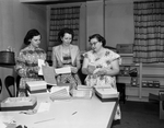 Stuffing Easter Seal envelopes for the Fort Worth Crippled Children's Society are, left to right, Madams William Vernon, R. H. Sells and A. T. Hughes. Published in Fort Worth Star-Telegram evening edition March 26, 1954
