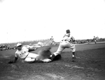 Texas Christian University's Bob White makes mighty effort to beat throw with slide at first base but it is too late as Southern Methodist University First Baseman, Jim Payne takes peg from Shortstop, Kermit Cummings in Southwest Conference game at Texas Christian University. Action came in eighth inning of opening game of season. Mustangs won with rally, 4-3. Published in Fort Worth Star-Telegram morning edition March 27, 1954.