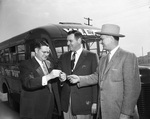 A. M. Pate Jr., left, Youth Men's Christian Association (YMCA) board president, presents keys for a new bus the board bought the organization to I. B. Hale, center, and Charlie Needham, members to the Y camp activities committee. Published in Fort Worth Star-Telegram morning edition March 25, 1954.