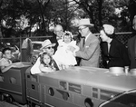City Manager Jones, right, helps 3-year-old Pamela Joy Hames into the 'Little Chief', a miniature duplicate of Santa Fe Railway's Texas Chief. Bill Hames, owner of the small Forest Park train, holds Jones' 3-year-old granddaughter, Nancy Jane Maples. J. P. Cowley, center, vice president and general manager of Santa Fe, attended the Little Chief's first run. Published in Fort Worth Star-Telegram morning edition March 29, 1954