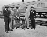 Santa Fe President Fred Gurley of Chicago, center, throws a switch opening a new stretch of Santa Fe line. Left to right are William Monroe, president of Brownwood Chamber of Commerce; G. E. Duffy of Chicago, vice president in charge of traffic for Santa Fe; Gurley; C. R. Tucker of Chicago, Santa Fe vice president in charge of operations; and J. P. Cowley of Galveston, vice president and general manager of the Gulf, Colorado and Santa Fe. Published in Fort Worth Star-Telegram morning edition March 30, 1954