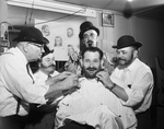 Pictured here, a barbershop quartet, trimming the beard of Warren Knee. The barbers are, left to right, Bob Patterson, Louis McFarland, Emmett Mahanay, and E. R. 'Shorty' Walker. Published in Fort Worth Star-Telegram morning edition April 4, 1954