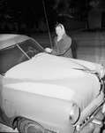 What Louanne Wade is shown doing was a chore duplicated hundreds of times all over Fort Worth where cars had been left out overnight in the drifting sleet and freezing drizzle. She's the daughter of Mr. and Mrs. Leonard R. Wade of 3724 Calmont, and is an Arlington Heights High School Cheerleader. A woman with a head scarf and coat standing by a car.