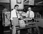 L. G. Timberlake, left, and F. Otis Phagans, right, busy preparing for the first annual "Do-It-Yourself" show at Leonard's Department Store west basement, where 65 manufacturing firms arrange exhibits. Published in Fort Worth Star-Telegram evening edition March 31, 1954