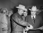 Tom F. Abbott, right, greets Everett McArthur, left, president of the Dickens County Sheriff's Posse of Spur, and Posse Member Buck Ballard. The group arrived in Fort Worth from Florida, where it then won the American Championship Polo Matches. Published in Fort Worth Star-Telegram morning edition April 1, 1954