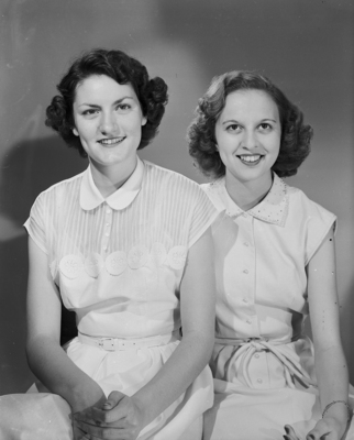 Misses Judy Engert, left, and Nancy Ward, right, graduating seniors who were complimented with a luncheon at Colonial Country Club. Published in Fort Worth Star-Telegram morning edition, May 21, 1950. An older woman and a young woman smiling wearing dresses.
