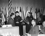 Amon Carter Jr. watches as Robert L. Smith, center, and C. A. Dennis, right, named outstanding police officers of 1953, admire their plaques. Carter presented a trophy and plaques to the officers on behalf of his father. Published in Fort Worth Star-Telegram evening edition April 1, 1954