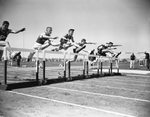 Sailing over high hurdles at North Texas Relays in Denton were, left to right, Joe B. Thompson and Jimmy Denton of Fort Worth Arlington Heights, Charles Duckett of Highland Parks and Marcus Alman, Gainesville. The finish: Alman, Duckett, Thompson and Denton. Published in Fort Worth Star-Telegram evening edition April 1, 1954.