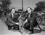 Royce Guerry, left, principal of Morningside Elementary School, and Dr. William E. Spain, secretary of Morningside Lions Club, place reflective tape on a bicycle at the Morningside school in a safety project sponsored by the club. Published in Fort Worth Star-Telegram evening edition April 2, 1954