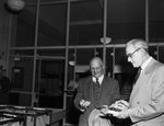 Postmaster D. C. Jernigin, right, presents Frank L. Rone with a watch, a pen, and pencil set that postal employees gave Rone for his retirement after 35 years of service in the registered mail division. Published in Fort Worth Star-Telegram evening edition April 2, 1954