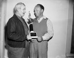 Track Coaches Jerry Saddler, left, of North Side and Johnny Stovall of Arlington Heights admire one of the trophies to be awarded for the Cowtown Relays at Farrington Field. Published in Fort Worth Star-Telegram evening edition April 4, 1954
