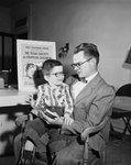 Bruce McKinley, 6, who is undergoing treatment for cerebral palsy, with his father, Robert McKinley, examining Easter seals. The seal sale will fund similar treatments. Published in Fort Worth Star-Telegram evening edition April 8, 1954