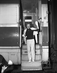 June Allyson, smiling and waving as she arrives in Fort Worth at the Texas and Pacific Station by train, to film scenes for Paramount's "Strategic Air Command" at Carswell Air Force Base. Published in Fort Worth Star-Telegram evening edition April 2, 1954