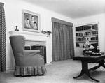Traditional furniture has an interesting setting in the home of Lieutenant Colonel and Mrs. Charles Van Vliet of 6463 Woodstock Road. Shades of brown, peach and turquoise blue combine to make a restful living room. An Emily Guthrie Smith portrait of the Van Vliet children adds charm. Published in Fort Worth Star-Telegram evening edition April 21, 1954.