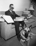 W. Howard Batis, reading one of the twenty volumes of the Bible in Braille he uses for studying the Methodist ministry. Sitting in front of Batis is his seeing eye dog, Dorine. Published in Fort Worth Star-Telegram April 7, 1954