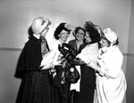 A quintet of members from the Sisters of the Swish in Cleburne invaded Fort Worth recently to sell tickets for the Johnson County Centennial celebration. Left to right, in old fashioned costumes are Mmes. Gilbert Johnson, Paul Ashley, whose husband is general chairman of the celebration; E. T. Herbert, a former Fort Worth resident, V. Barr, and A. Madsen, who is president of the Sisters of the Swish. Published in Fort Worth Star-Telegram morning edition May 8, 1954.