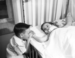 Billy Joe, left, kneeling next to Joyce Marie Faulker, reclined in bed. Published in Fort Worth Star-Telegram evening edition April 7, 1954