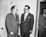 Newt Wilson, left, of New York, president of Sky Chefs, Inc., and William Hrabrick, manager of Sky Chefs at Amon Carter Field, check the program for the managers' conference at Hotel Texas. Published in Fort Worth Star-Telegram morning edition April 8, 1954