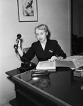 Dorothy Schimek, shown sitting at a desk holding a phone in her office. Published in Fort Worth Star-Telegram evening edition April 8, 1954