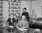 Mayor Deen signs a proclamation designating April 24 as "Official Ticket Sales Rally Day" for Boy Scouts of Longhorn Council. With him at the signing ceremony were, left to right, Terry Gish of 5017 Locke, a Cub Scout of Pack 18, Yucca District; Mike Rooke of 3832 Winslow, Scout from Troop 21, Horned Frog District, and David W. Ashley Jr. of 4436 Lovell, an Explorer Scout of Post 2016. Published in Fort Worth Star-Telegram morning edition April 11, 1954.