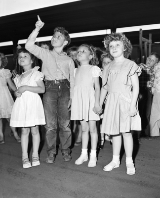 Part of Fort Worth's outgoing mail was on inspection as 70 first and second graders from the Decatur Elementary School made a tour of the T&P Passenger Station. Waiting to bard the Fort Worth & Denver City Zephyr home are, left to right, Dona Berg, Royce Simpson, Glenda Beth Hilton and Janice Renshaw. Approximately 60 of the 70 children had never ridden a train before. Published in Fort Worth Star-Telegram morning edition May 19, 1950.