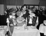 The table was set by Watanka Camp Fire girls in a special class at the Junior Woman's Garden Club flower show at the Garden Center. Admiring the table are the club's new president, Mrs. Donald G. Wilson, and little daughter, Michelle, as Camp Fire Girls, Patricia Dell Elliott, left, and Catherine Kemmerer, right, look on. Published in Fort Worth Star-Telegram morning edition April 11, 1954.