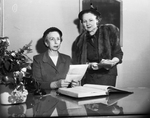Wives of delegates to the 68th annual Lumbermen's Association of Texas convention, being held in Fort Worth for awhile, and will participate in many of their husbands' convention activities, and have many courtesies of their own. In the picture, right to left, is Mrs. Ralph G. Campbell, chairman, and Mrs. E. B. Ingram, co-chairman respectively of women's activities for the convention, check over last minute changes in plans. Published in Fort Worth Star-Telegram, April 11, 1954.