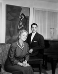 Mrs. A. A. Webster, 2612 Forest Park Boulevard, recently was elected president of University Place Music Club. An unidentified man is sitting behind her. Published in Fort Worth Star-Telegram evening edition April 16, 1954.