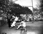 Paschal Second-baseman Harry Andrews beats home throw from right field with winning run as Poly Catcher, Hunter Enis tries late for tag. Action happened in sixth inning of game which Panthers won, 1-0. Watching paly is Umpire F. F. (Rube) Leissner. Published in Fort Worth Star-Telegram evening edition April 10, 1954.