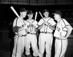 Manager Mel McGaha, right, of the league-leading Shreveport club pauses with three of his top "lumber" specialists, left to right, Jim Ackeret, Everett Joyner and Ed Mickelson. Their averages, entering the Fort Worth series were.303, .359 and.500, respectively. Published in Fort Worth Star-Telegram morning edition April 21, 1954.