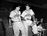 Shortstop, Joe Koppe, left, and Right Fielder, Harry Heslet of league-leading Shreveport team now playing Cats. Koppe is sensational defensively. Heslet led league in home runs last year. Published in Fort Worth Star-Telegram evening edition April 20, 1954.