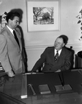 Tommy Vandergriff, left, began a second year as president of the Arlington Chamber of Commerce as his father, Hooker Vandergriff, was honored as the city's citizen of the year. Published in Fort Worth Star-Telegram morning edition May 26, 1950.