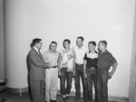 Dr. E. J. Howell, president of Tarleton State College congratulates the first place livestock judging team from Brown County. Left to right, Howell, Don Decker, assistant agent of Brown County, Victor Scovers, Howard David, Dwayne Grooms, and Jimmy Brim. Published in Fort Worth Star-Telegram morning edition April 11, 1954.