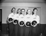 The Finley team of Houston took Class A team championship in 23rd Texas State Bowling Association Tournament which ended here. They shot torrid 3.103. Left to right, Captain Billy Welu (608), Berry Risinger (651), E. H. Treybig (664), E. C. Hanson (611), and Don Ellis (569). Published in Fort Worth Star-Telegram evening edition April 13, 1954.
