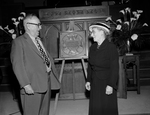 Mrs. Mattie Van Zandt stands beside the bronze marker she unveiled at Broadway Baptist Church, commemorating organization of the Baptist Training Union Convention. Walter Shedd, left, and Mrs. Van Zandt attended the organizational meeting in 1891. Published in Fort Worth Star-Telegram morning edition April 12, 1954.