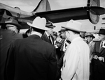 Charles A. Lindbergh, left center, the "Lone Eagle" who in 1927 first flew solo across the Atlantic Ocean, talks with Fred Korth, right center, in a circle of men during the Air Force Academy commission's visit. Published in Fort Worth Star-Telegram evening edition April 12, 1954.
