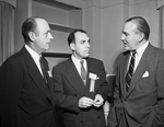 Arthur S. Goldman, right, of New York, discusses open-end mortgage possibilities in Texas with Byron Saunders, left, of the Texas Insurance Commission, and W. B. Carssow, of Austin, Counsel for the Lumbermen's Association of Texas. They are on a panel featuring the mortgage subject at the association convention. Published in Fort Worth Star-Telegram morning edition April 13, 1954.